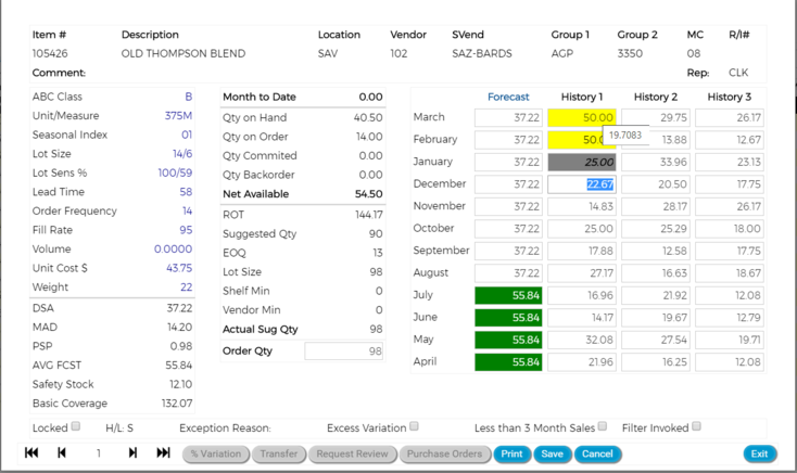 Once the changes to the history are saved, the forecast values will be immediately recalculated for both the Order and the Item. These alternate history changes are permanent and will persist going forward. Users are able to edit all 36 months of history.