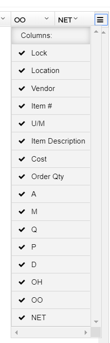 Going across the review pane: many of the columns are self-explanatory showing the locations #, vendor #, item description, unit of measure, unit cost, and the amount being recommended for the order. The first column is a column headed with "Lock". This feature lets you lock an item so it is not impacted by the goal seeking feature. The lock will happen automatically if you use the special discount calculation. The lock can also be set by simply clicking on the item and then clicking the "Lock/Unlock" button in the lower right part of the screen. Conversely, the item can be unlocked by the same procedure.