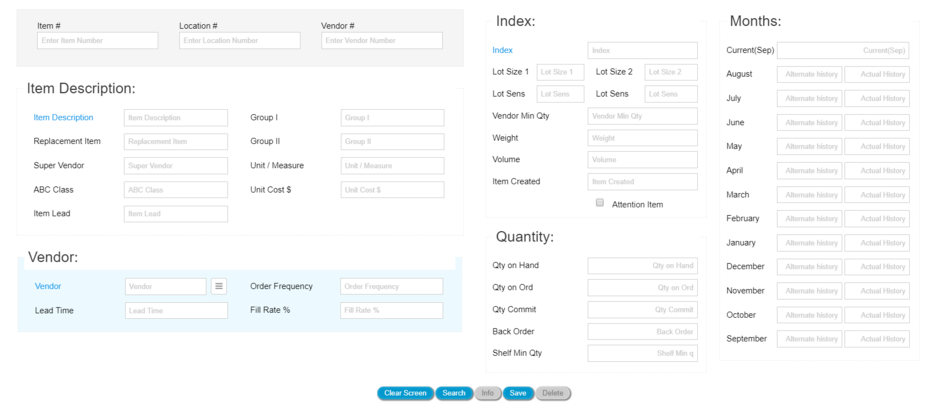 The Item Maintenance page manages data records of individual SKU's or items. To access an existing record, a user may enter an Item #, locations, and optionally a Vendor #.